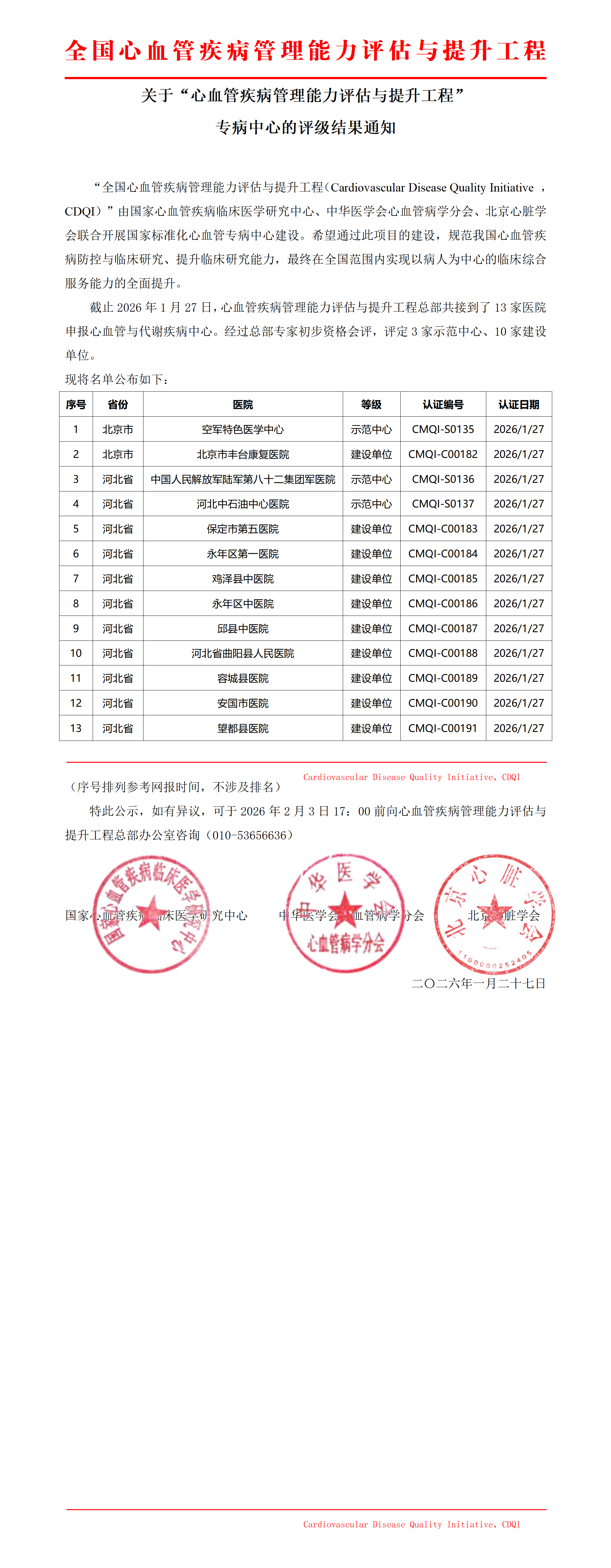 关于标准化心血管与代谢疾病中心评级结果通知-北京市、河北省